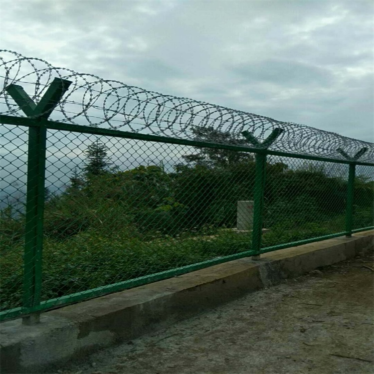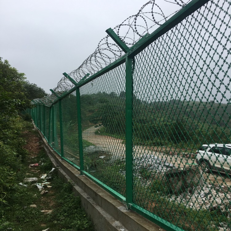 機場鋼筋圍界就是機場圍欄網又稱作“Y型安全防御護欄網”,是由V型支架立柱,加強型焊接片網,安全防盜連接件和熱鍍鋅刀片刺籠組成強度和安全防御性級別很高。近年來,被廣泛應用在機場,軍事基地等高安全場所。注:如果在機場護欄網頂部加裝刀片刺絲、刀片刺繩后又很好的增強了安全防護性能。采用電鍍、熱鍍、噴塑、浸塑等防腐形式,具有很好的抗老化、抗曬、耐候等特點。其產品造型美觀、花色多樣,既起到圍欄作用,又起到美化作用。由于具有安全性高、防攀爬能力好,網片連接方式采用特制SBS緊扣件,有效防止人為的破壞性拆卸,橫向四道折彎加強筋,使網面強度顯著增加。